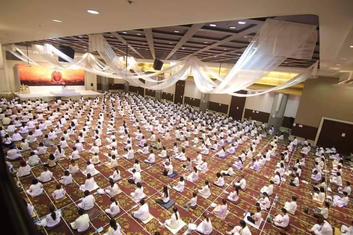 Dr. Ddnard Napattalung, who donated land and multi-million-dollar funding to establish the Compass Meditation Centre in Thailand, is guiding meditation in the grand hall — a spacious sanctuary